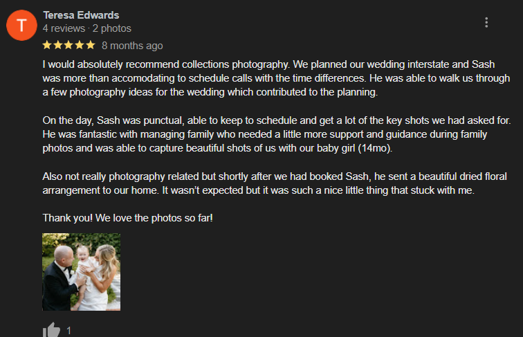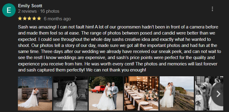 I've been doing wedding photography in Melbourne for over 20 years. If you don't like my work, you get 100% of your money back!