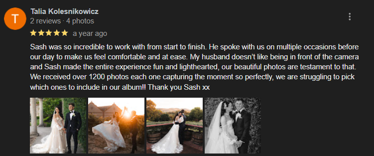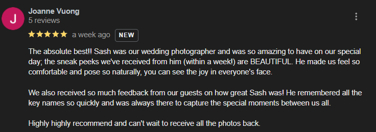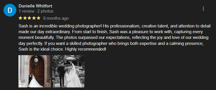 "He captured beautiful moments from our special day that we will treasure forever. Thank you!"